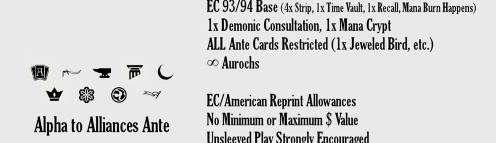 This format was originally invented by the Music City Old School Crew, all you do is add ante cards to the Eternal Central 93/94 restricted list and rules set. Below is basically a copy and paste job from both of their websites.